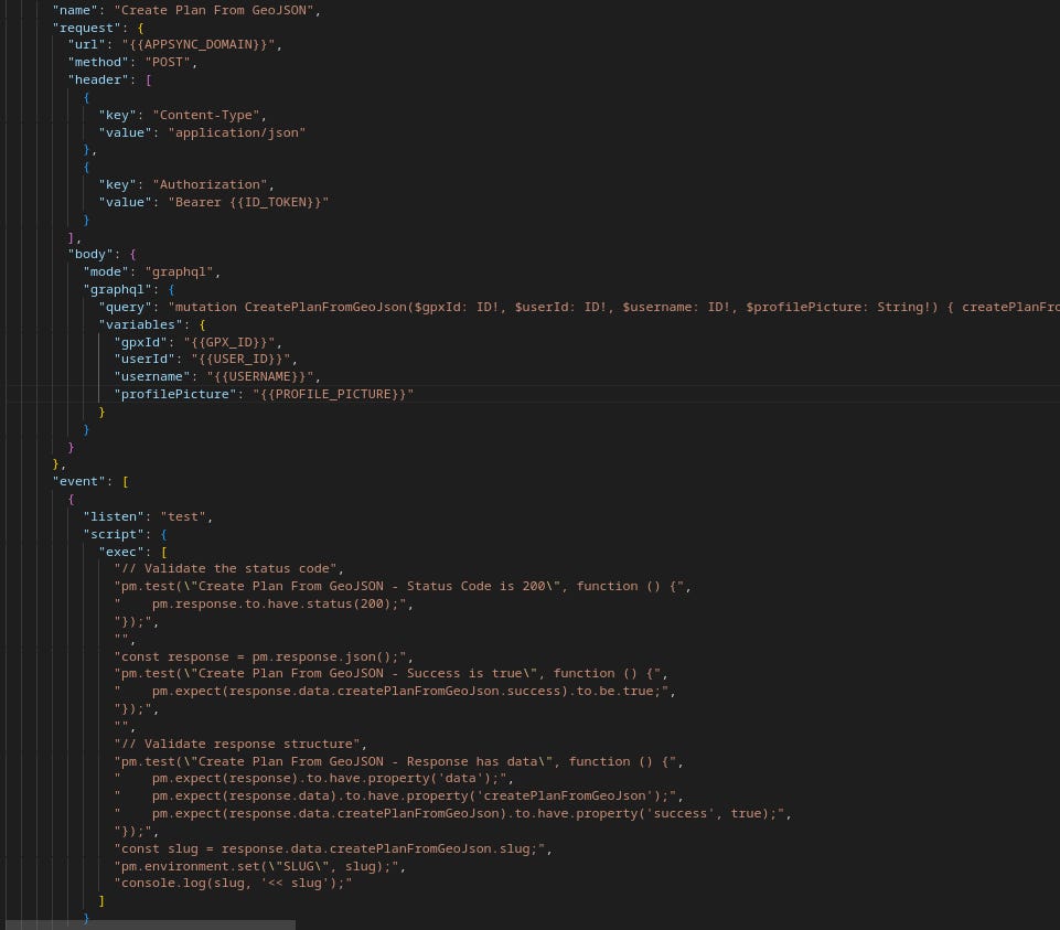 What came out looked like this: readable, but un-typeable. Since my workflow didn’t include actually creating working calls inside Postman, being able to produce this file directly is a huge win and eliminates the need to directly manage tests.